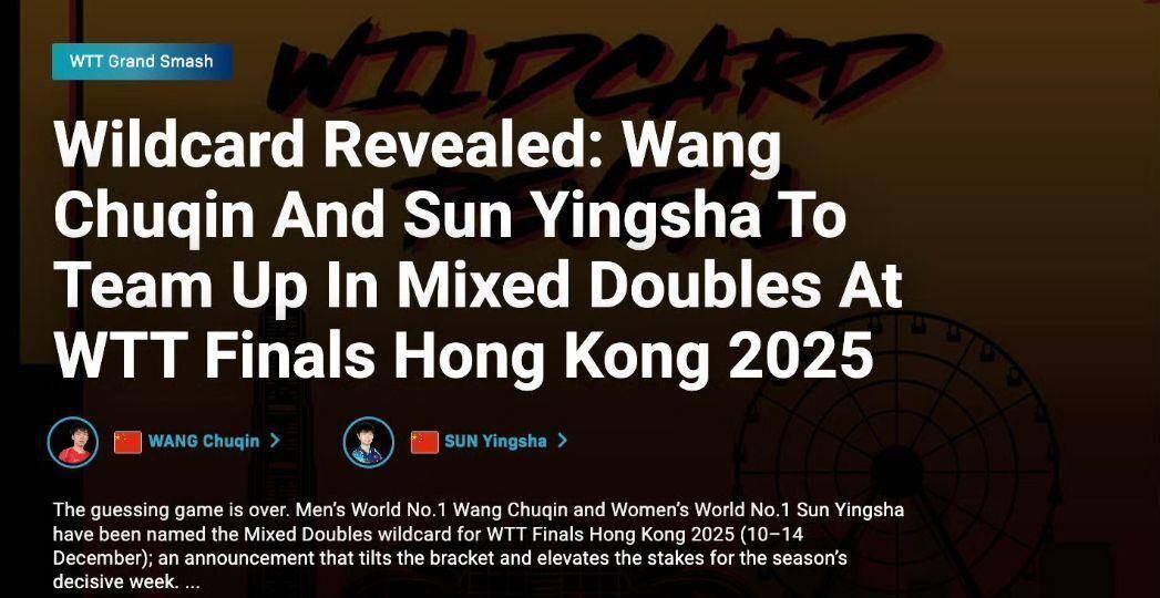 网球联赛,ATP赛程,WTA积分,网球直播入口,网球世界排名,四大满贯赛/实时更新全球网球联赛2025赛程、比分、排名及直播,全面覆盖ATP男子联赛、WTA女子赛事、四大满贯及国内网球比赛,为中文网球迷提供权威资讯与竞猜预测支持。世界排名第一的混双组合,竟然需要一张外卡才能踏进总决赛大门? 这听起来像是个黑色幽默,却是王楚钦和孙颖莎正在面对的现实。 11月26日晚WTA官宣那一刻,无数球迷在欢呼声中夹杂着错愕:凭什么金牌搭档要靠特殊通道入场?